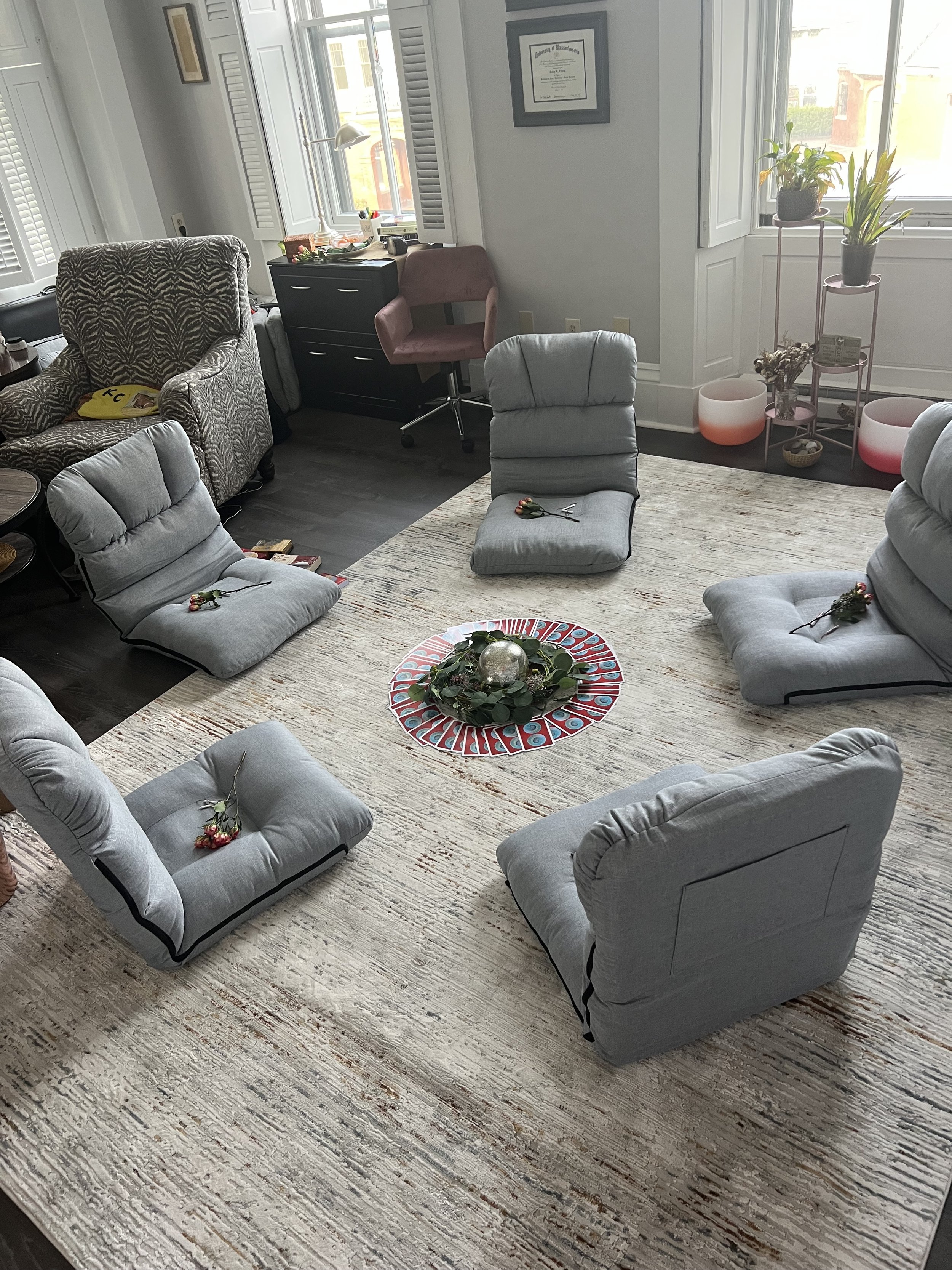 Sessions may include guided meditations, sound therapy, energy healing, oracle cards, teachings, journaling, and meaningful supportive conversation